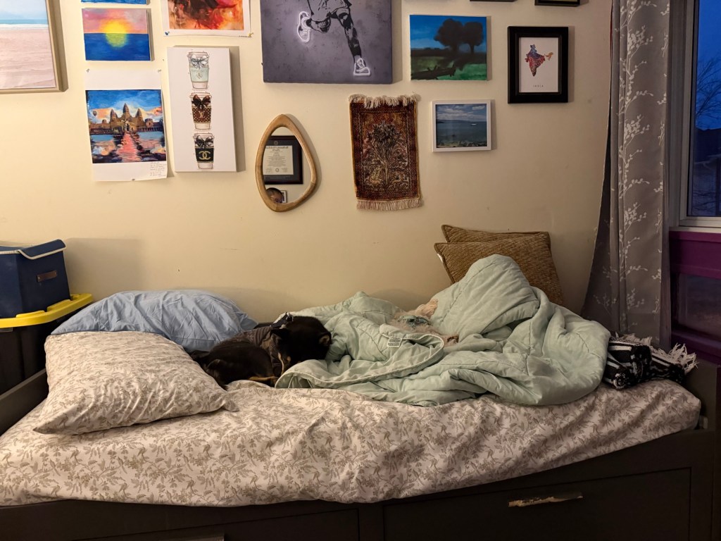 (my bedroom & two dogs asleep on my bed….)
